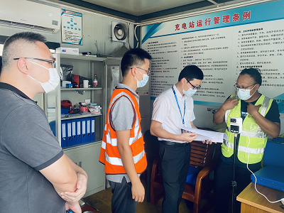 2022年7月5日15:00,東莞市發展和改革局電力科關敬輝科長偕同萬江街道經濟發展局工作人員到達東莞市莞慧充新能源科技有限公司石美充電站,在我司副經理羅炳安以及安全部、綜合技術部相關人員的陪同下,展開了“安全生產月”的工作檢查。